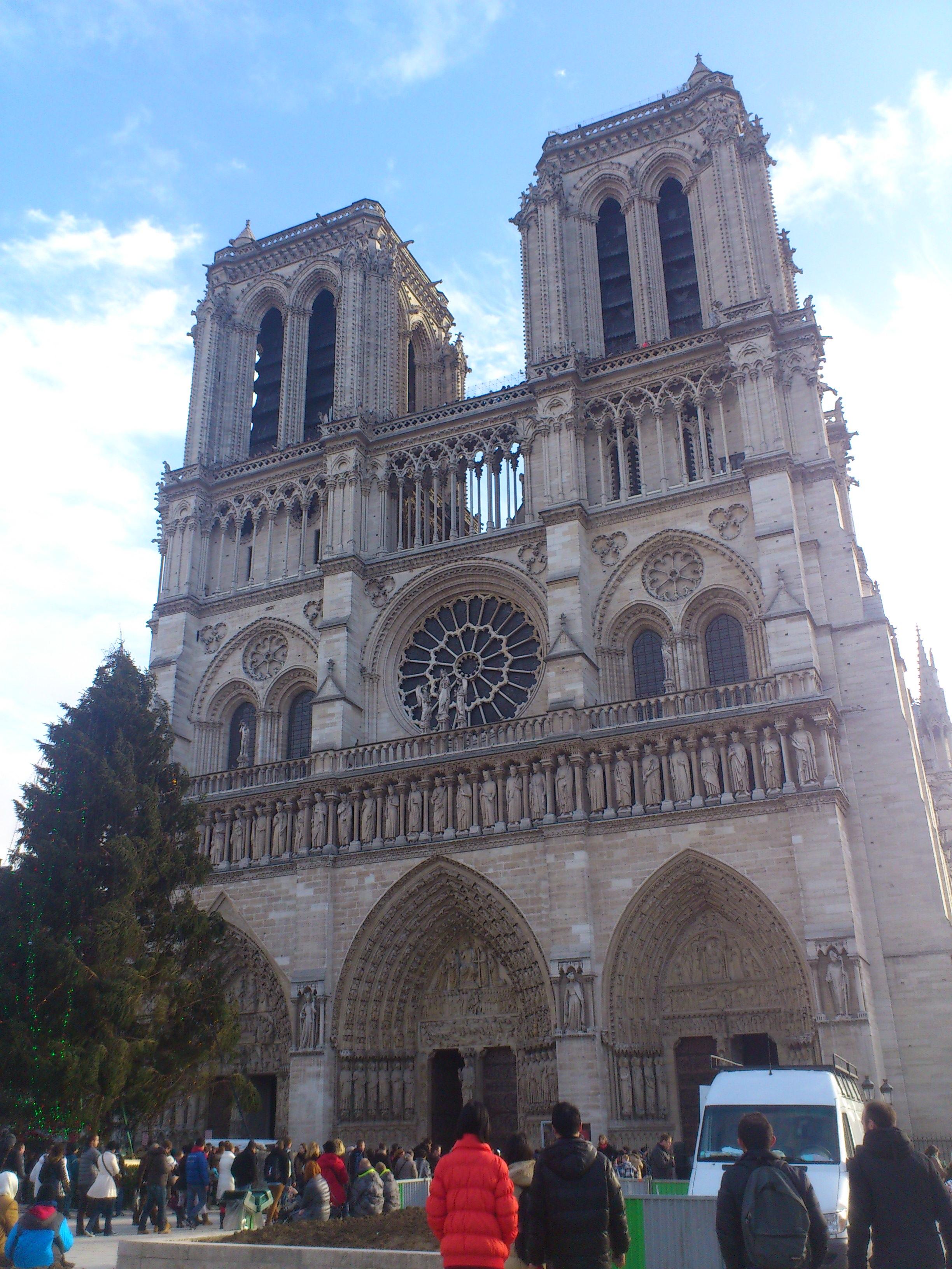 巴黎圣母院(Notre Dame)巴黎圣母院不仅因雨果的同名小说而出名,更因为它是巴黎最古老最宏伟的天主教堂。这座哥特式的巨石建筑物,历经两百年, 建成于1345年。教堂形体方正, 仪态庄严。正面朝西分三层,高69米,底层并排三座桃形大门洞,左为圣母门,右为圣安娜门,中为最后的审判。门上布满 了雕饰,描述圣经的故事。门卷上是长 条壁龛,一字排着28座雕像。