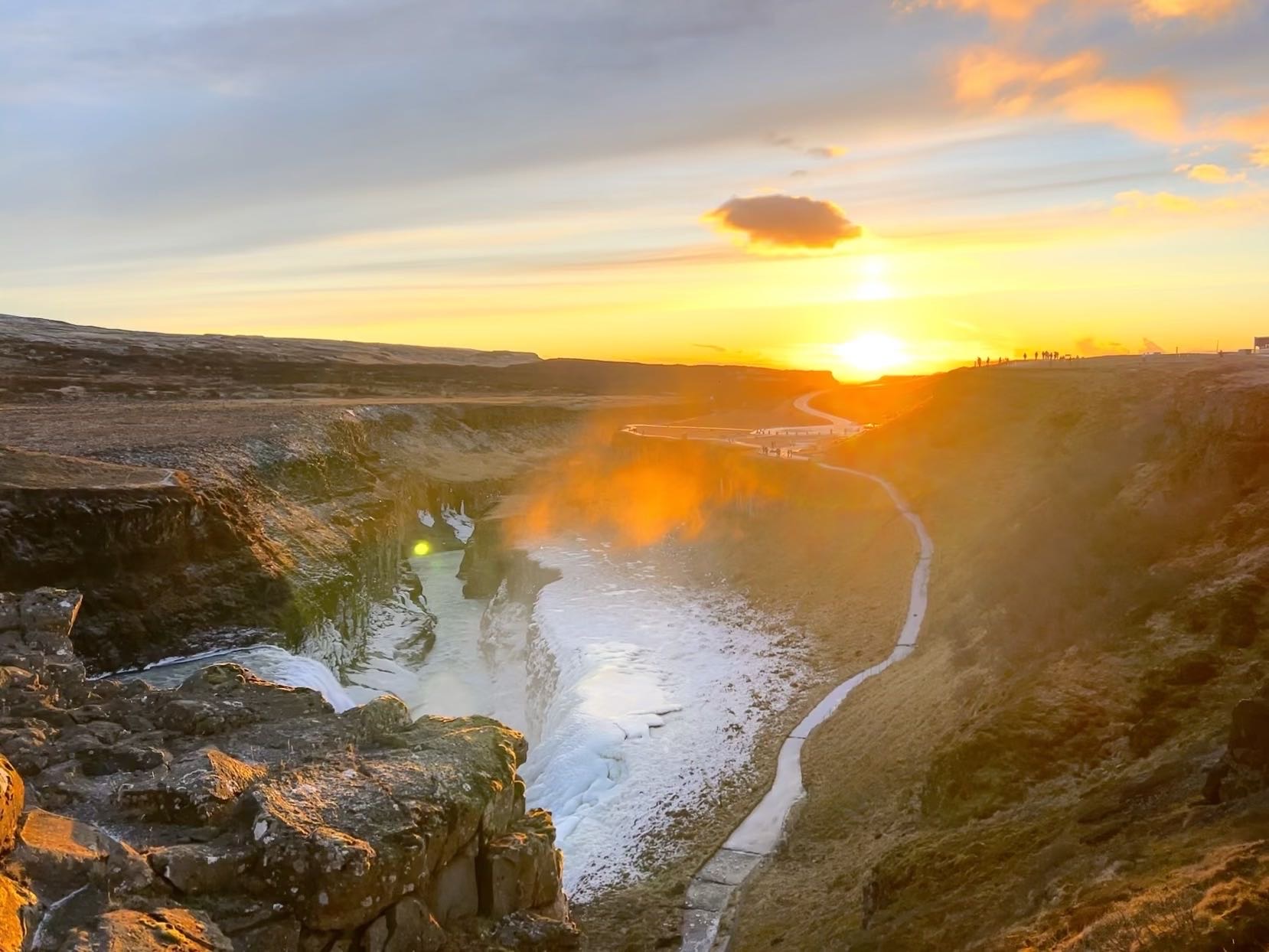 是冰岛的第二大瀑布,也是冰岛最漂亮的瀑布之一,之所以被赋予黄金之名,除了因为河水本身略带黄色的缘故外;亦因黄昏时候,整座瀑布会被日落的太阳染成金黄色,造成有如黄金般的珍贵美景而命名。