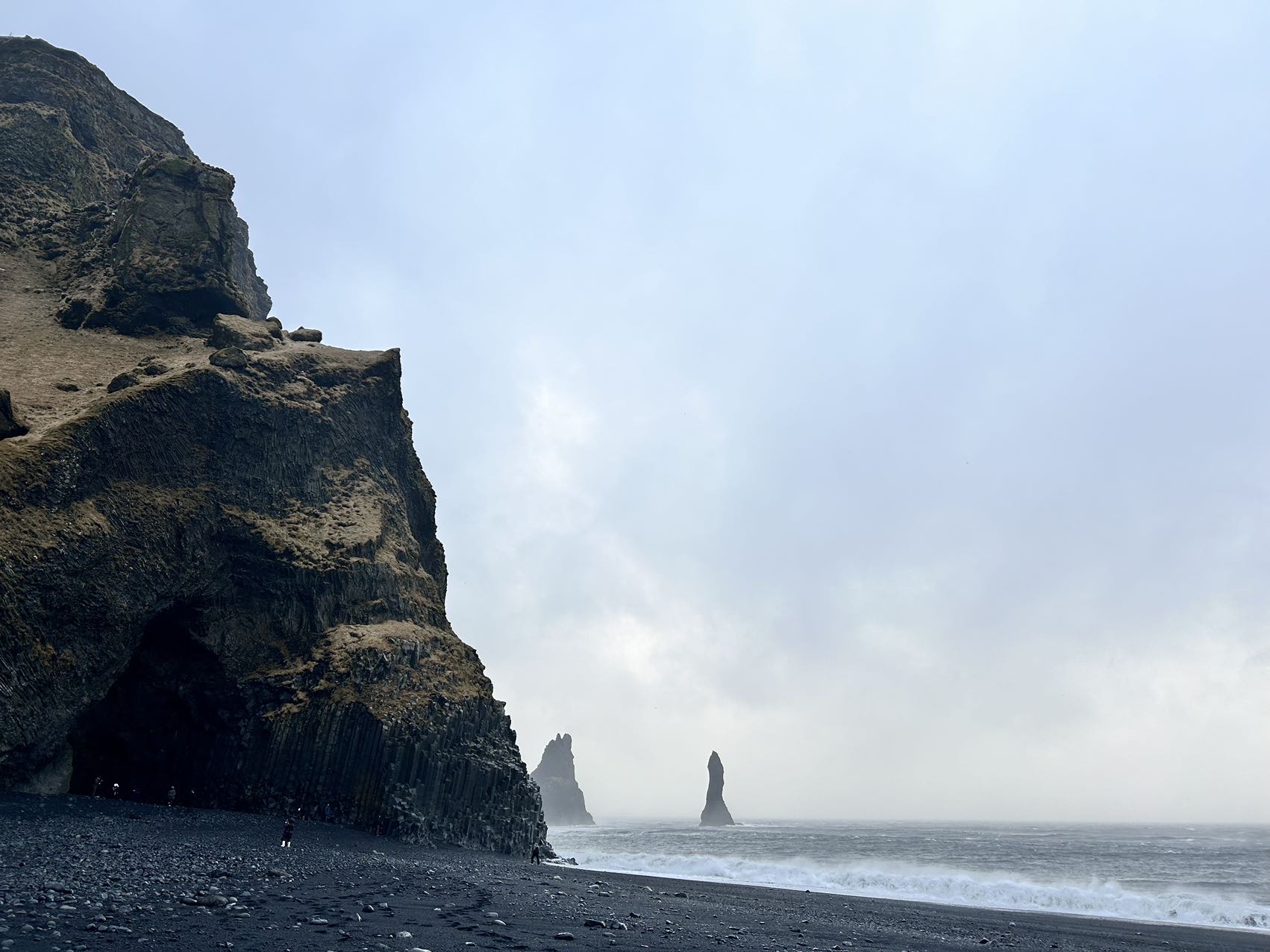黑沙滩,其是火山爆发后冷却的黑曜岩被风化后所形成的沙滩。由于它黑得天然,黑 得通透,海水在丝毫未受影响的情形下依然清澈,在阳光下泛着金色的微光。进入黑沙滩有两个入口。其中一个是开到Vik后,从 Reynishverfisvegur转进去,这里可以看到整片的黑沙滩,还有一大排玄武岩组成的石头。