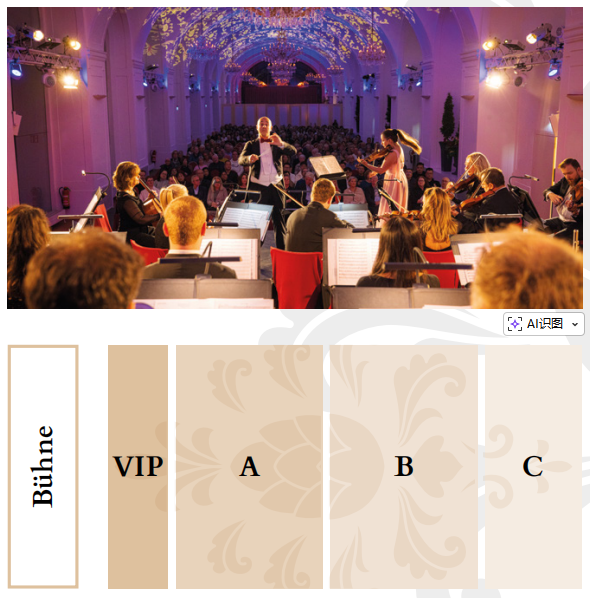 3、在美泉宫音乐会上,您可以在所选的座位类别内自选座位。(官网系统设置价格默认为C区坐席,请知悉!)